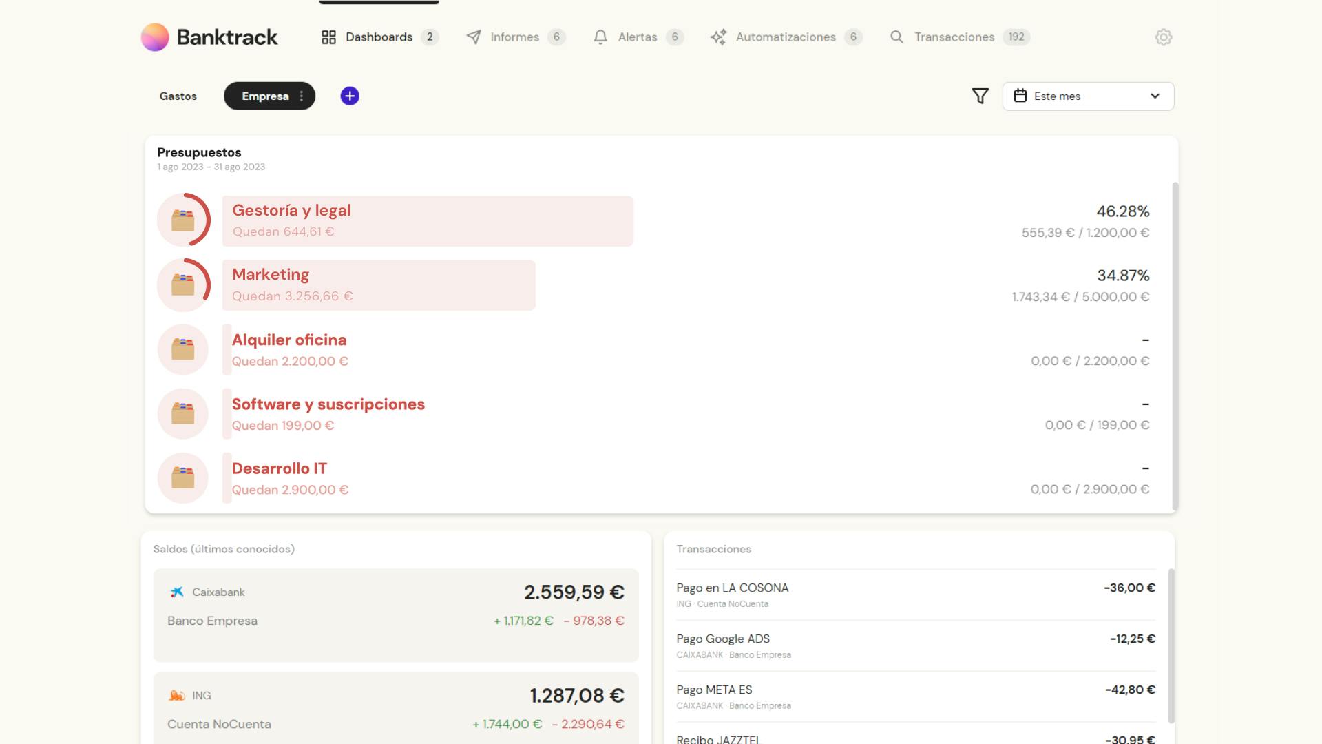 Banktrack permite establecer presupuestos por categoría de gasto y recibir alertas cuando los gastos superan los límites establecidos.