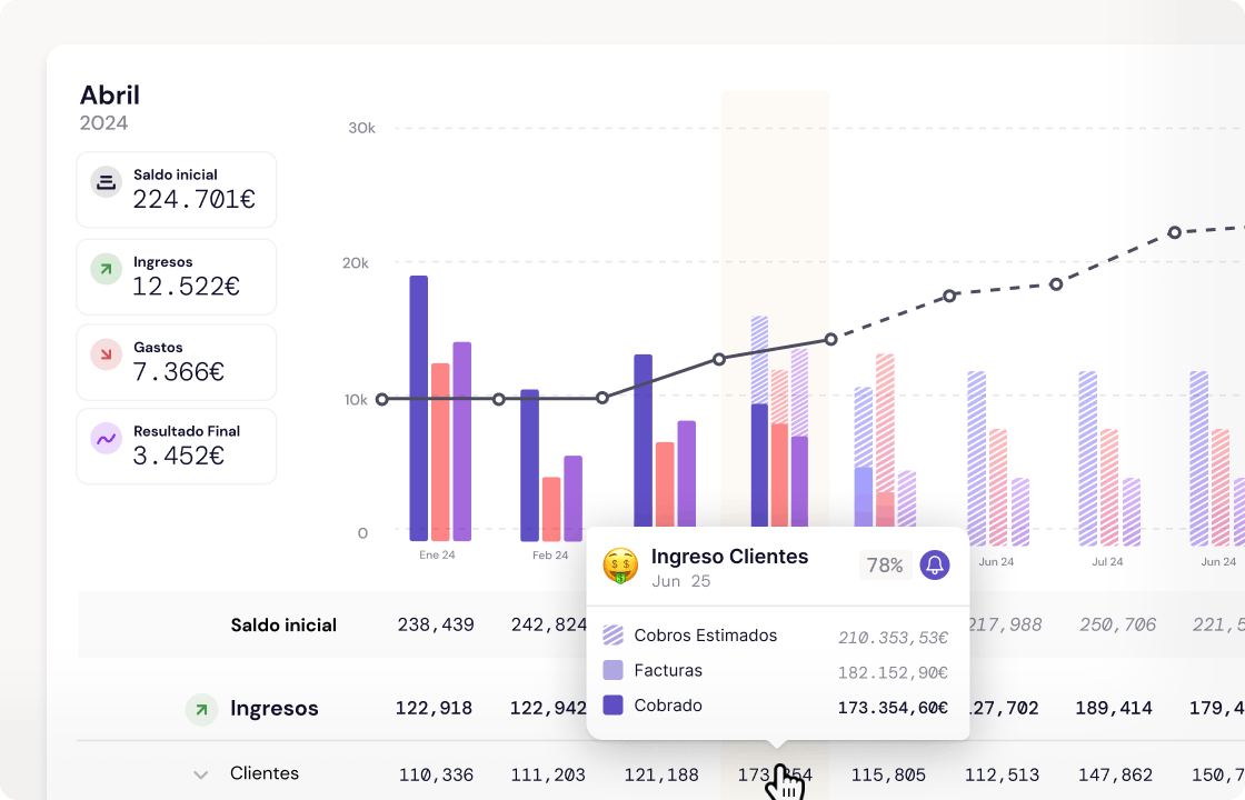 - Cuadros de tesorería conectados con tus bancos y actualizados en tiempo real.